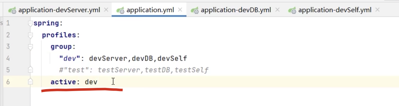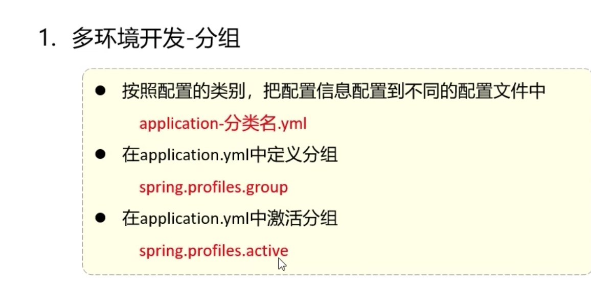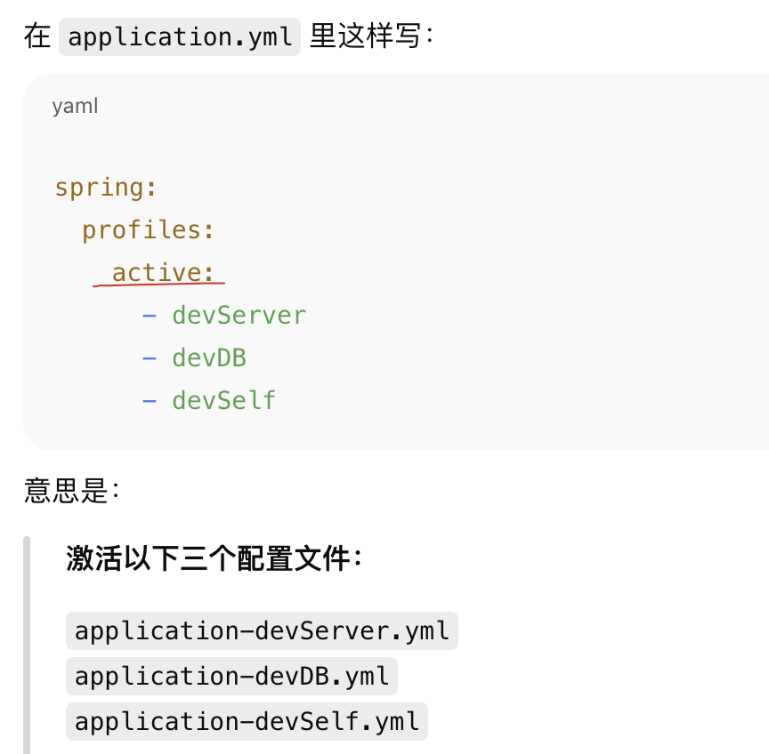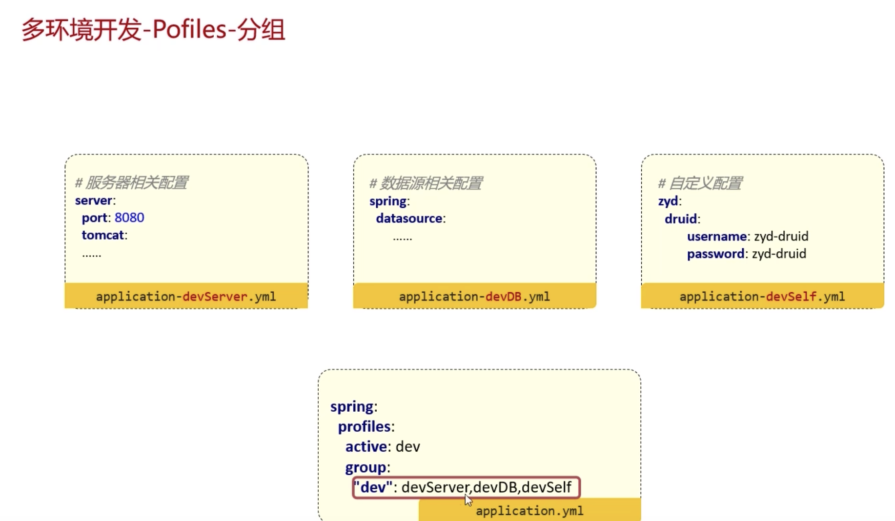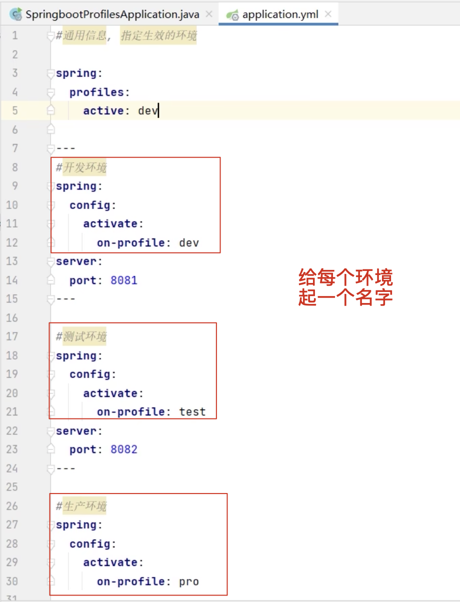 所以,Spring Boot 允许我们:把同一个环境的配置再分拆成多个文件 ,比如 开发环境(dev) 下:
