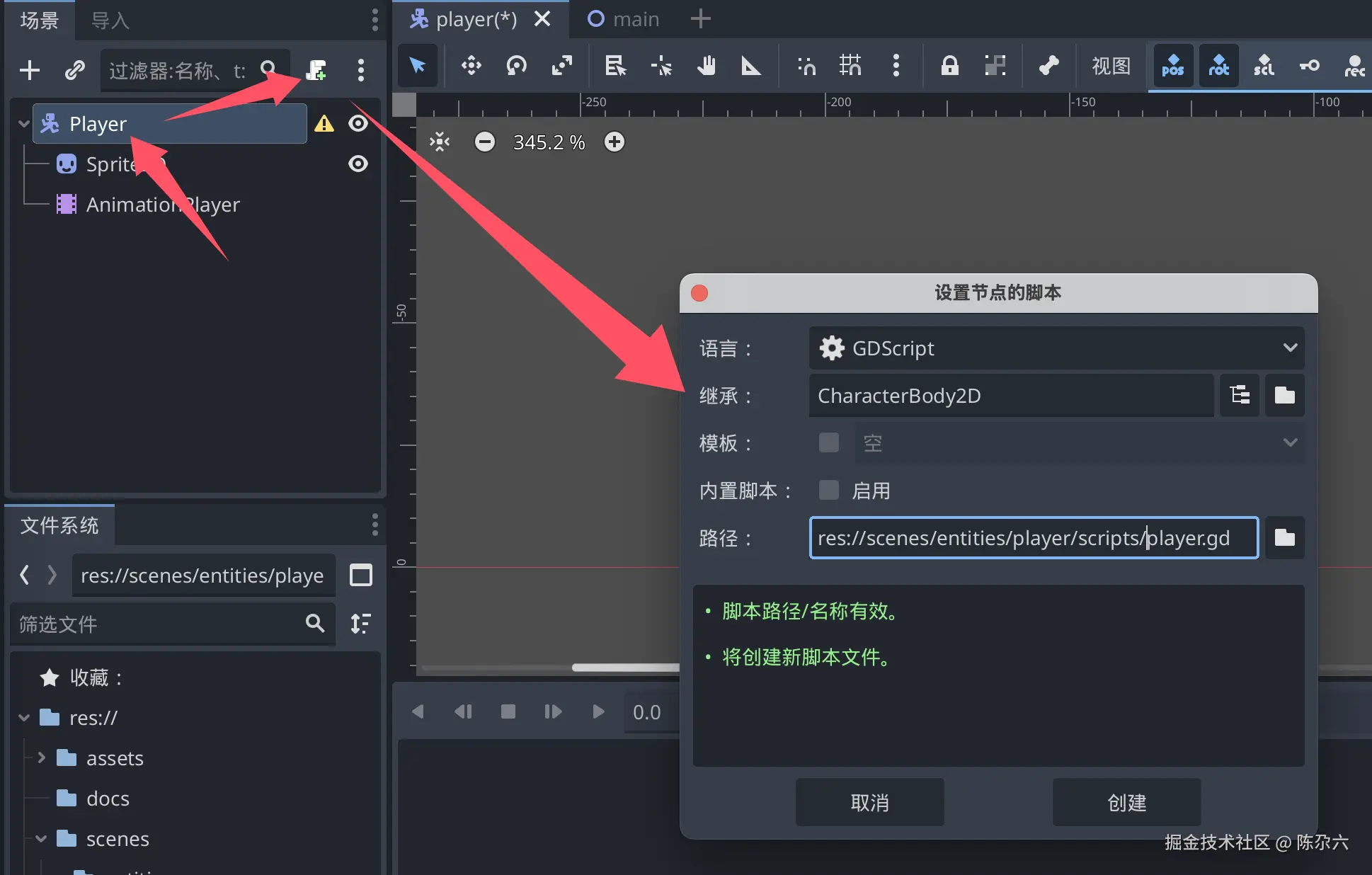 接下来我们给player角色添加脚本。选中Player节点,然后点击添加脚本,将脚本命名为player.gd,并保存到scenes/entities/player/scripts目录下。