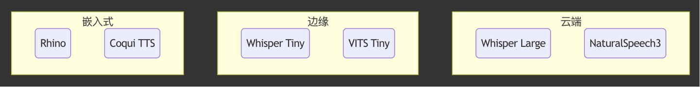 开发者在设计语音应用系统时,不仅要关注模型的准确率和速度,还必须考虑"部署环境"的限制与优势。以下是三种典型部署架构: