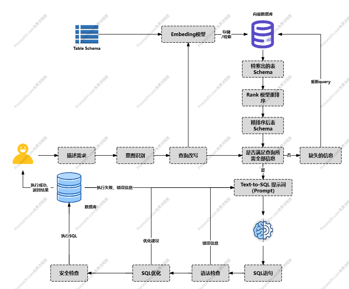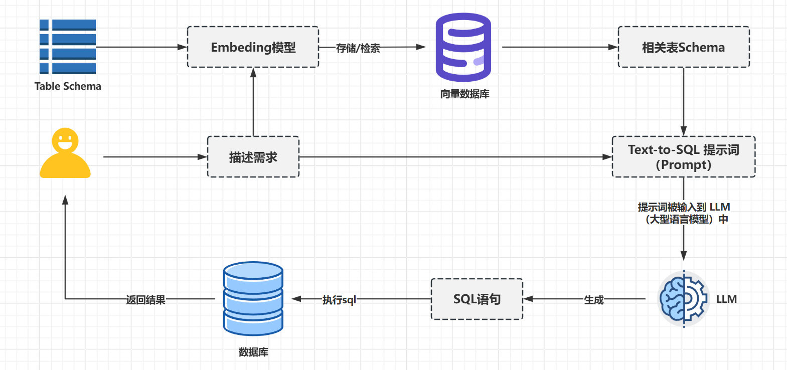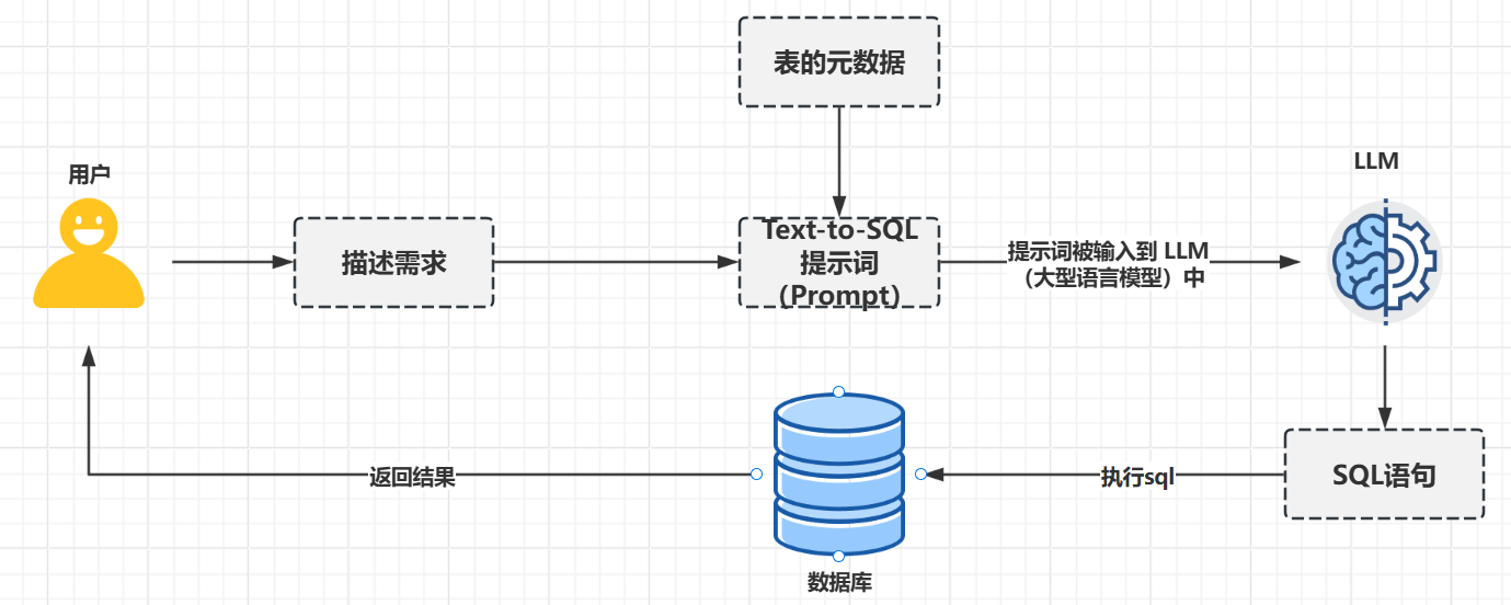提示词被输入LLM(大型语言模型),模型基于提示词中的上下文(用户需求 + 相关表结构),生成符合语法规范且匹配业务逻辑的SQL语句。 - 执行与反馈 :生成的