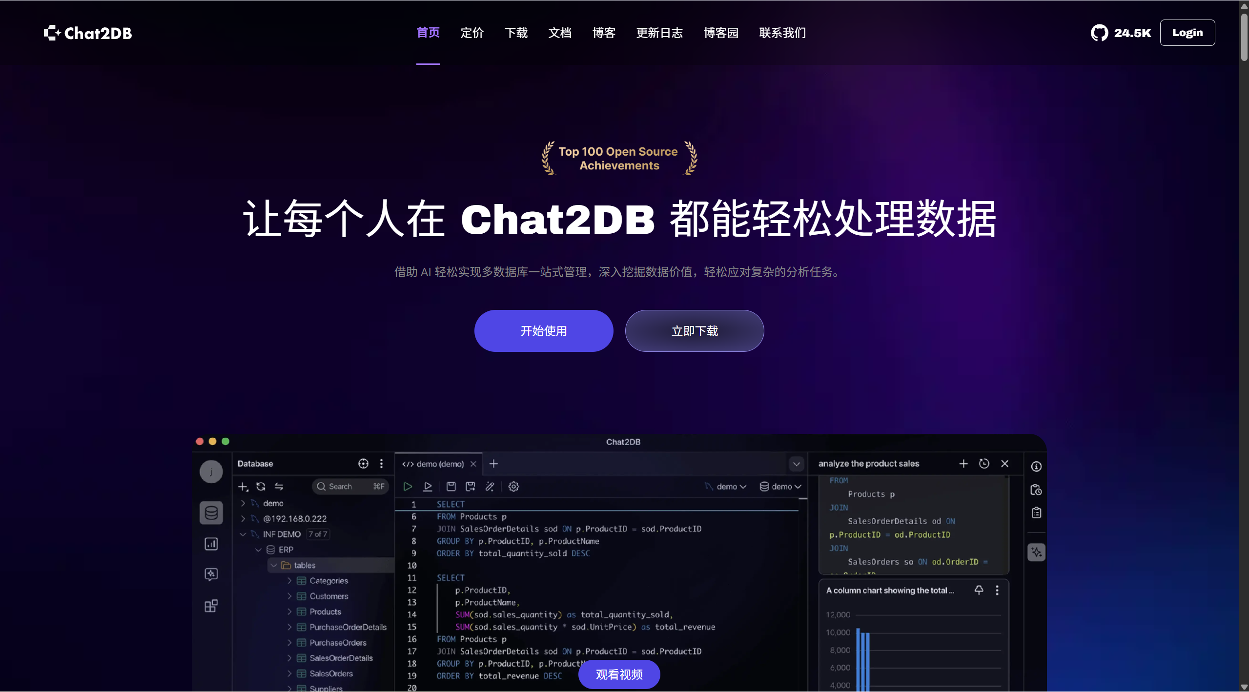 Chat2DB 是一款AI first的数据管理、开发、分析工具,它的核心是AIGC(Artificial Intelligence Generation Code)能力,它可以将自然语言转换为SQL,也可以将SQL转换为自然语言,也可以自动生成报表,极大的提升人员的效率。通过一个产品可以实现数据管理、数据开发、数据分析的能力,即使不懂SQL的运营业务也可以使用快速查询业务数据、生成报表能力。