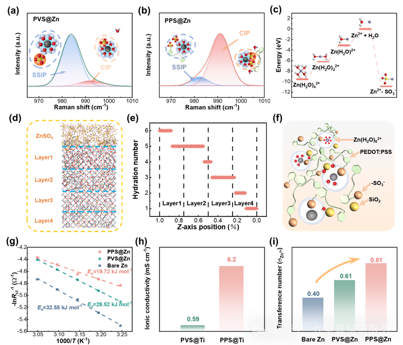 图3. (a, b)不同锌电极的 ν-SO42- 拉曼谱带:PVS@Zn(a)与 PPS@Zn(b);(c)Zn2+ 脱溶及输运过程中各物种间键合能的 DFT 计算结果;(d)分子动力学快照展示 Zn2+ 水合簇的脱溶过程;(e)特定层区内 [Zn(H2O)₆]2+ 配位水总数的演化;(f)PPS 界面处 [Zn(H2O)₆]2+ 脱溶过程示意图;(g)基于对称电池不同温度 EIS 数据拟合的 Arrhenius 曲线及活化能 Ea;(h)PVS 与 PPS 界面的离子电导率;(i)裸 Zn、PVS@Zn 和 PPS@Zn 的 Zn2+ 迁移数。