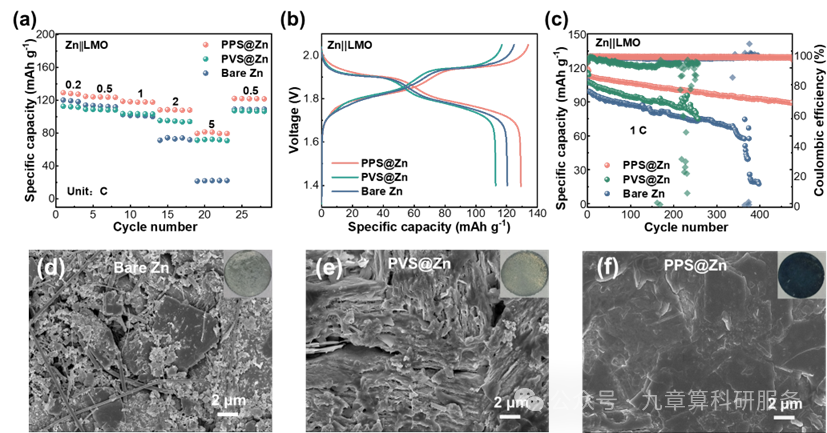 图6. 水系 Zn||LMO 全电池电化学性能:(a)倍率性能;(b)恒流充放电曲线;(c)1 C 下的循环寿命。1 C 下循环100圈后的锌负极 SEM 形貌:(d)裸 Zn;(e)PVS@Zn;(f)PPS@Zn。