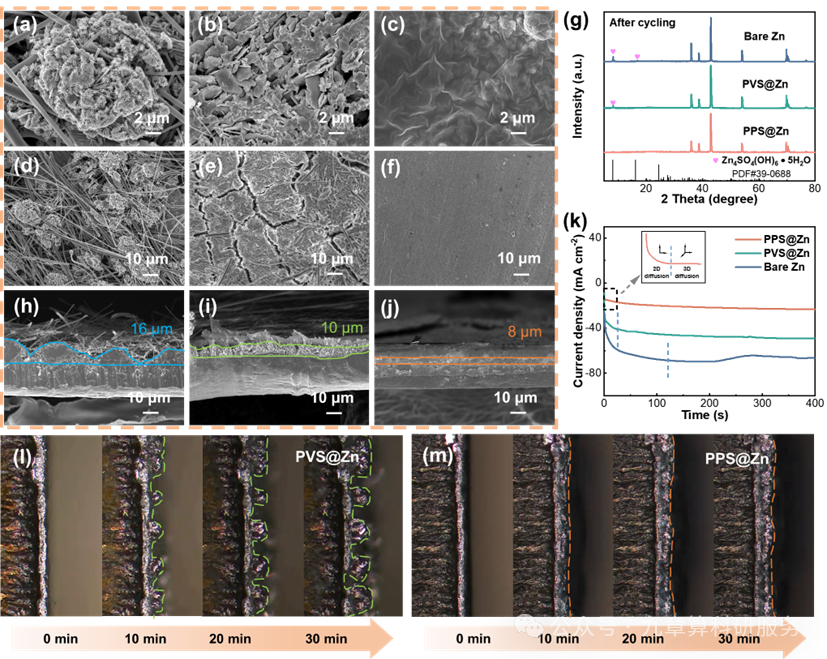 图5. 对称电池 Zn||Zn 在 4 mA cm-2、2 mAh cm-2 条件下循环 50 次后负极形貌:(a, d)裸 Zn;(b)PVS@Zn 基底;(c)PPS@Zn 基底;(e)PVS@Zn 界面层;(f)PPS@Zn 界面层。(g)循环后负极的 XRD 谱图。Zn||Cu 半电池在 2 mA cm-2 下沉积 4 mAh cm-2 后的截面 SEM:(h)裸 Zn;(i)PVS@Zn;(j)PPS@Zn。(k)对称电池在 −150 mV 恒电位下的计时电流(CA)曲线。10 mAh cm-2 电镀过程中不同锌阳极的原位光学照片(l)PVS@Zn 与(m) PPS@Zn