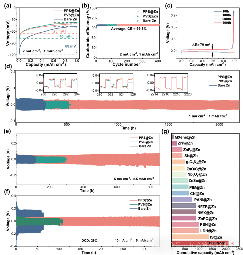图4. (a)Cu||Zn 半电池在 2 mA cm-2/1 mAh cm-2 首次镀锌过程中的电压-容量曲线;(b)镀锌/剥锌的库仑效率对比;(c)PPS@Zn||PPS@Cu 半电池的典型电压曲线;对称电池长循环性能:(d)1 mA cm-2/1 mAh cm-2、(e)5 mA cm-2/2.5 mAh cm-2 与(f)10 mA cm-2/5 mAh cm-2;(g)PPS@Zn 负极与近期文献中采用人工界面层策略的锌阳极循环寿命对比图。