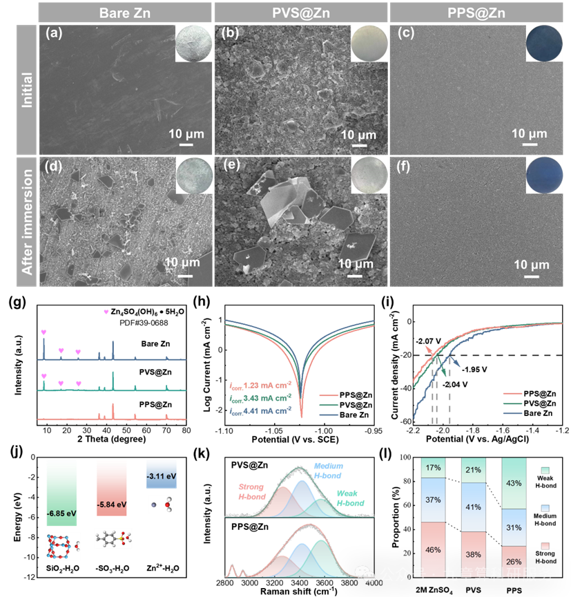 图2. (a--c)裸锌、PVS@Zn 与 PPS@Zn 负极的 SEM 表面形貌;(d--f)各负极在 2 M ZnSO4 电解液中浸泡 10 天后的 SEM 照片,插图为对应光学照片,(g)浸泡后负极的 XRD 谱图,(h)Tafel 曲线;(i)LSV 曲线。(j)DFT 计算的 Zn2+、--SO3- 基团、SiO2 与水分子之间的结合能。(k)PVS@Zn 与 PPS@Zn 的 O--H 伸缩区拉曼光谱;(l)基于拉曼光谱分析的 2 M ZnSO4、PVS 界面与 PPS 界面中强、中、弱氢键比例。