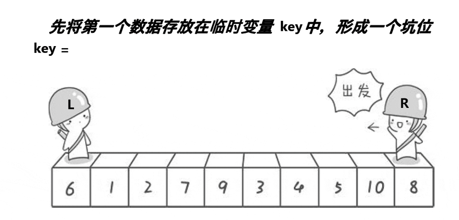 - 用变量存储基准值,并在此处形成坑,创建左右指针(一个指向数组头一个指向数值位)