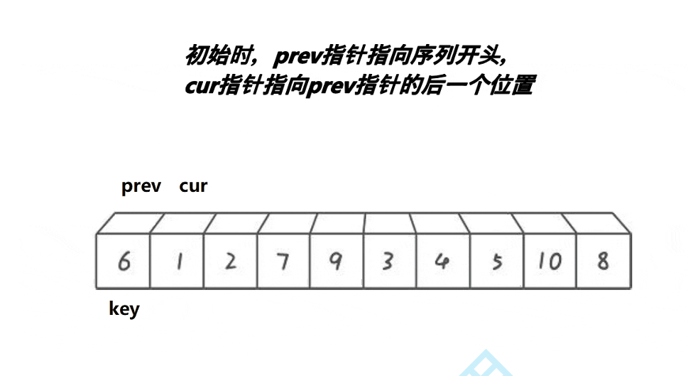 prev和pcur,初始时prev指向数组第一个元素,pcur指向后面prev后面一个元素 - 当