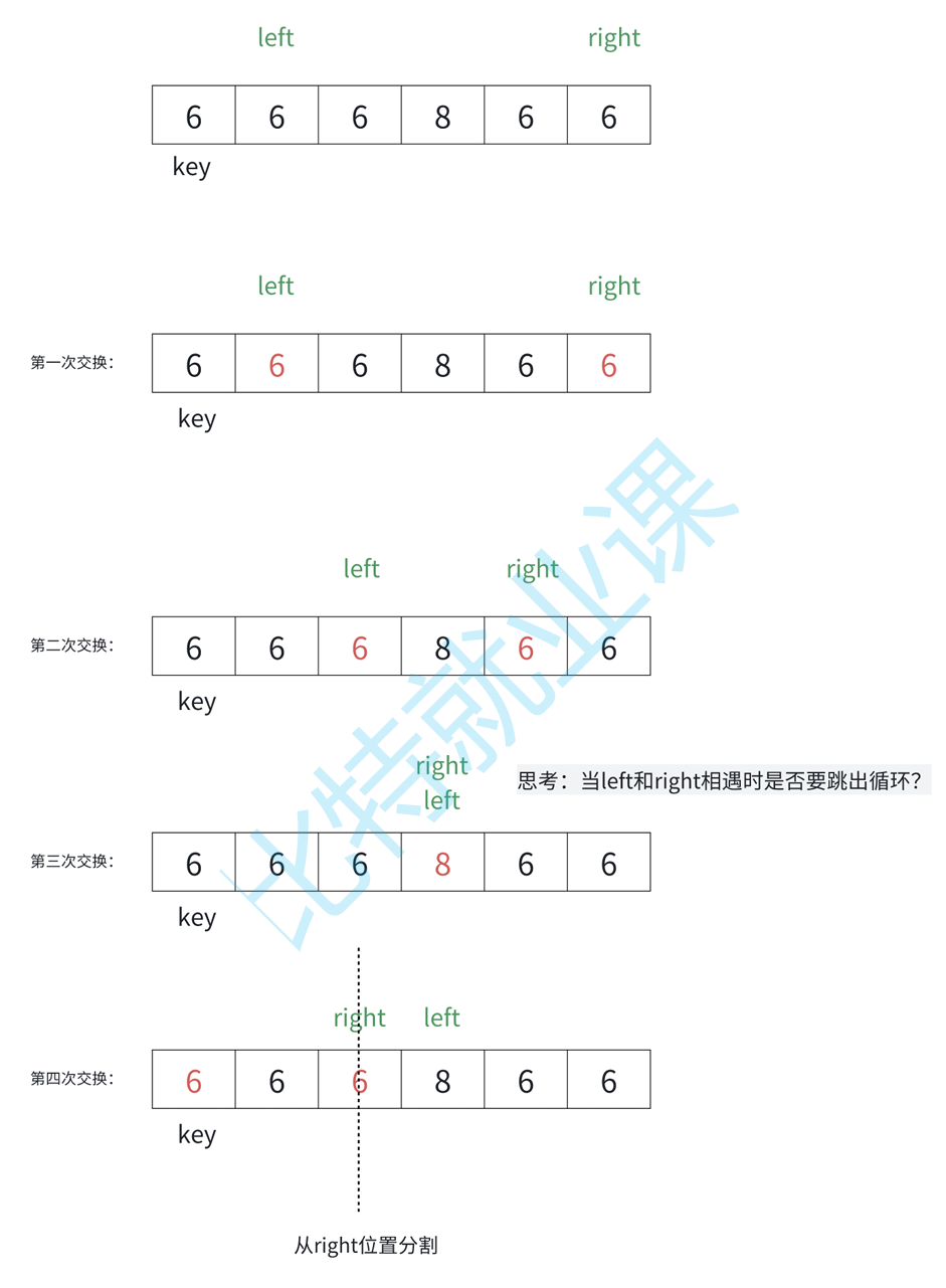 right从右往左找比基准值小或等于的,left从左往右找比基准值大或等于的。找到后,left和right对应下标元素互换。