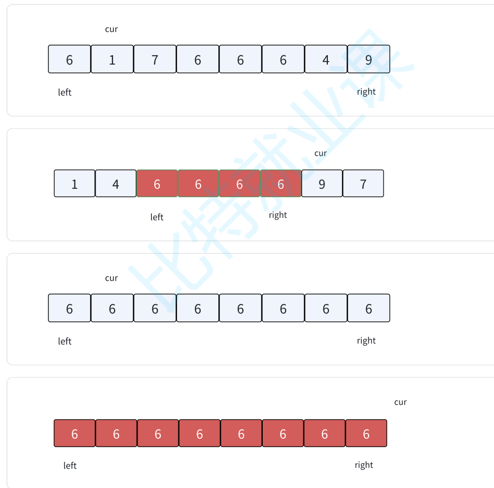 -left指向区间最左边,right指向区间最后边,cur指向left+1位置cur遇到⽐key⼩的值后跟left位置交换,换到左边,left++,cur++cur遇到⽐key⼤的值后跟right位置交换,换到右边,right--cur遇到跟key相等的值后,cur++- 直到