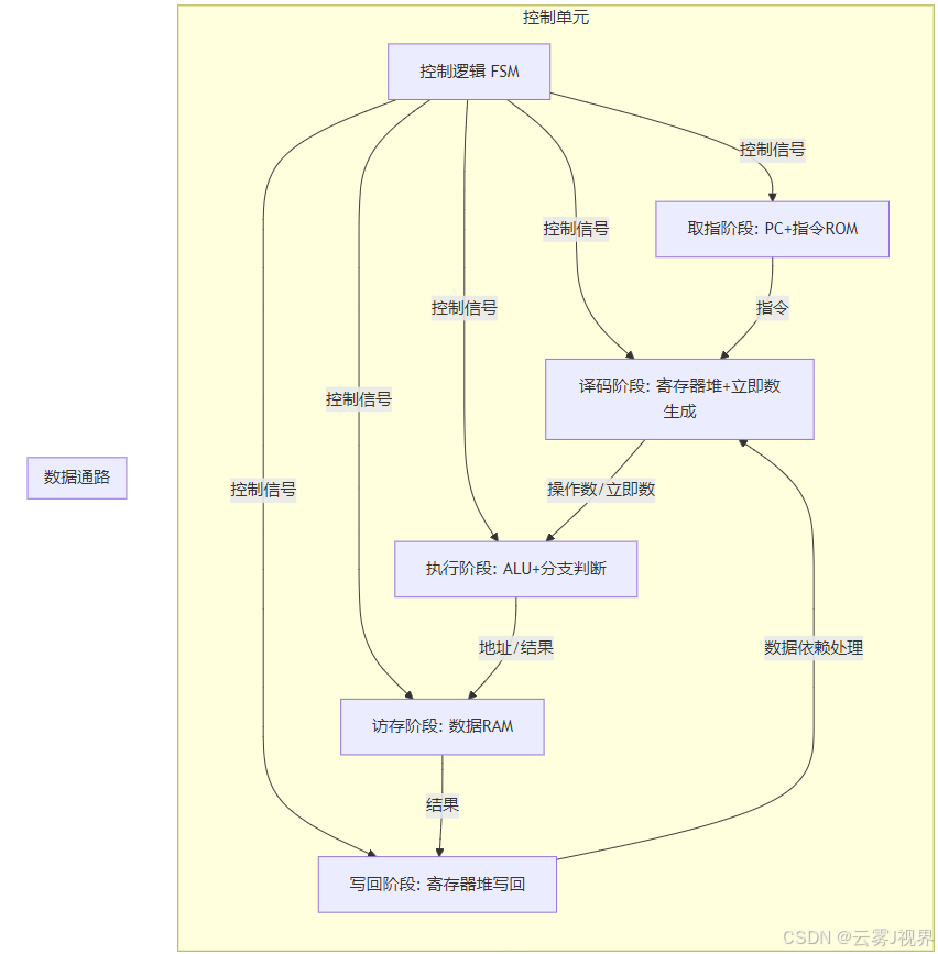 采用经典数据通路与控制单元分离架构,流水线分为取指(IF)、译码(ID)、执行(EX)、访存(MEM)、写回(WB)五级,架构图如下: