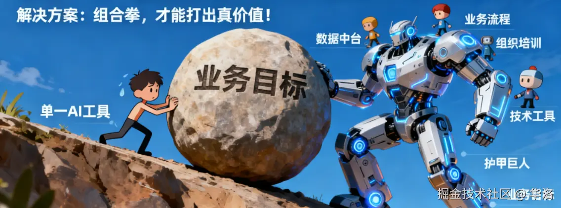 因此,AI的价值必须通过"解决方案"实现------将AI工具与数据中台、业务系统、治理框架整合,才能避免"高投入、低实效"的悖论。