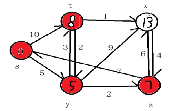 然后重复2、3步骤,选择集合V中的最短一条边,添加对应点t到集合U,更新集合V,从源点s到x的距离可以为9(5+3+1)比上一次更新后集合V中的距离13(5+2+6)更小,那么更新集合V中x的数据