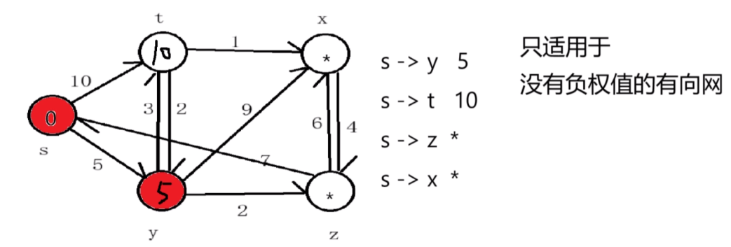 将y添加到集合U中,更新到V集合中的点,此时可以到达的顶点t更新为8(5+3)、顶点z更新为7(5+2)、顶点x更新为14(5+9),