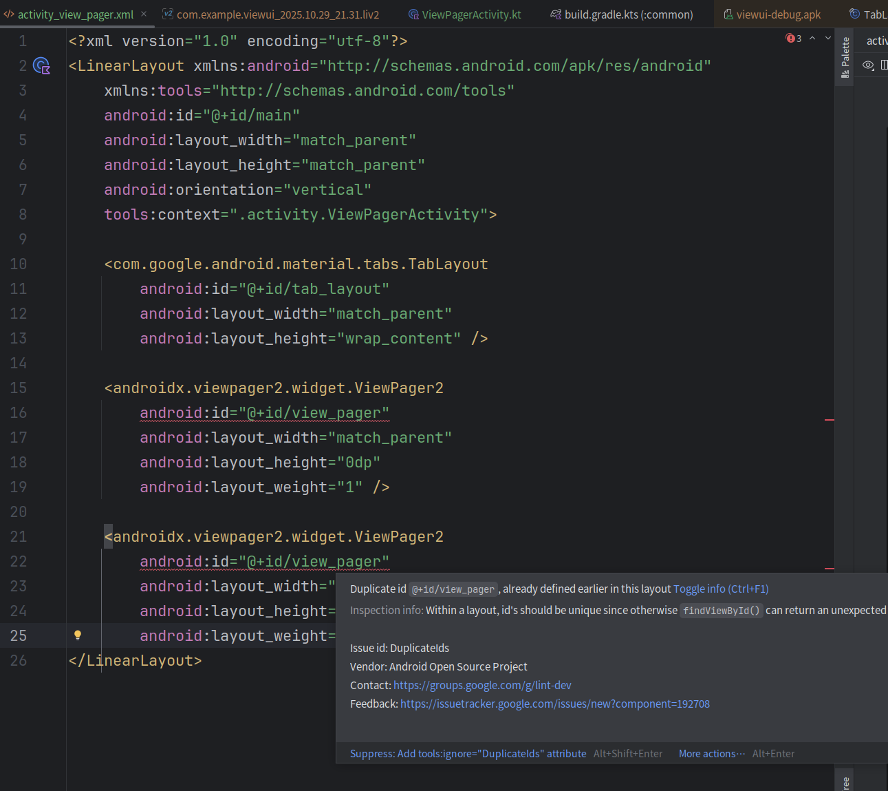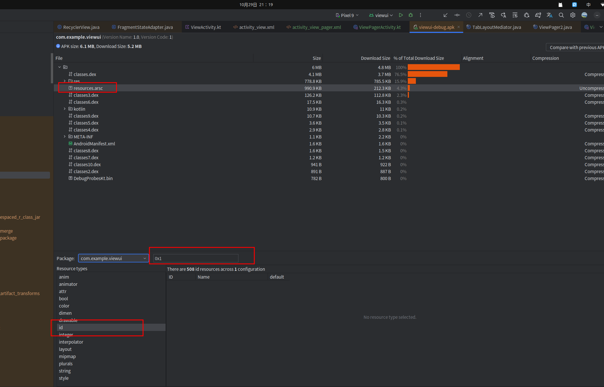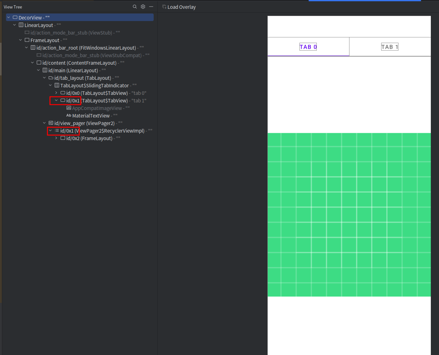 最后用layout inspector v2查看了布局文件,找到了0x1的id。tabLayout的id与Viewpager的ReclerView id相同了,都为1。