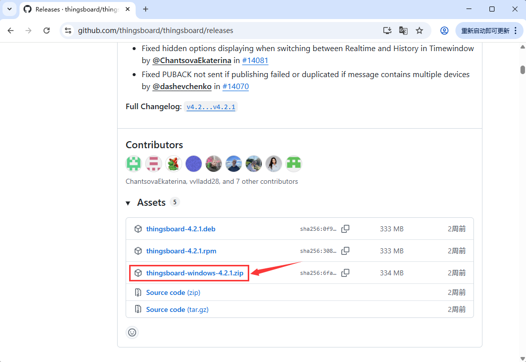 4,访问 ThingsBoard 官方 GitHub Releases 页面,点此查看,找到最新的稳定版本,下载 Windows 版本的 .zip 文件,将下载的 ZIP 文件解压到一个你喜欢的目录,例如 D:\Software\thingsboard 。