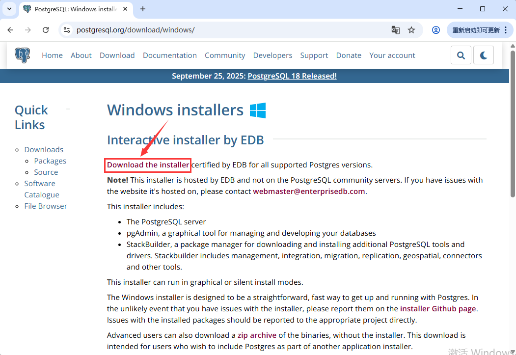 2,访问 PostgreSQL 官网下载页面,下载并安装适用于 Windows 的 PostgreSQL ,点此下载。