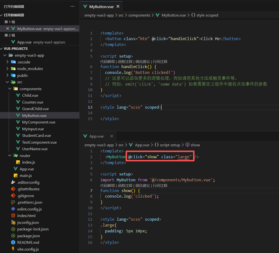 将 3 中的示例 子组件 MyButton.vue 进行改造,添加上述代码: