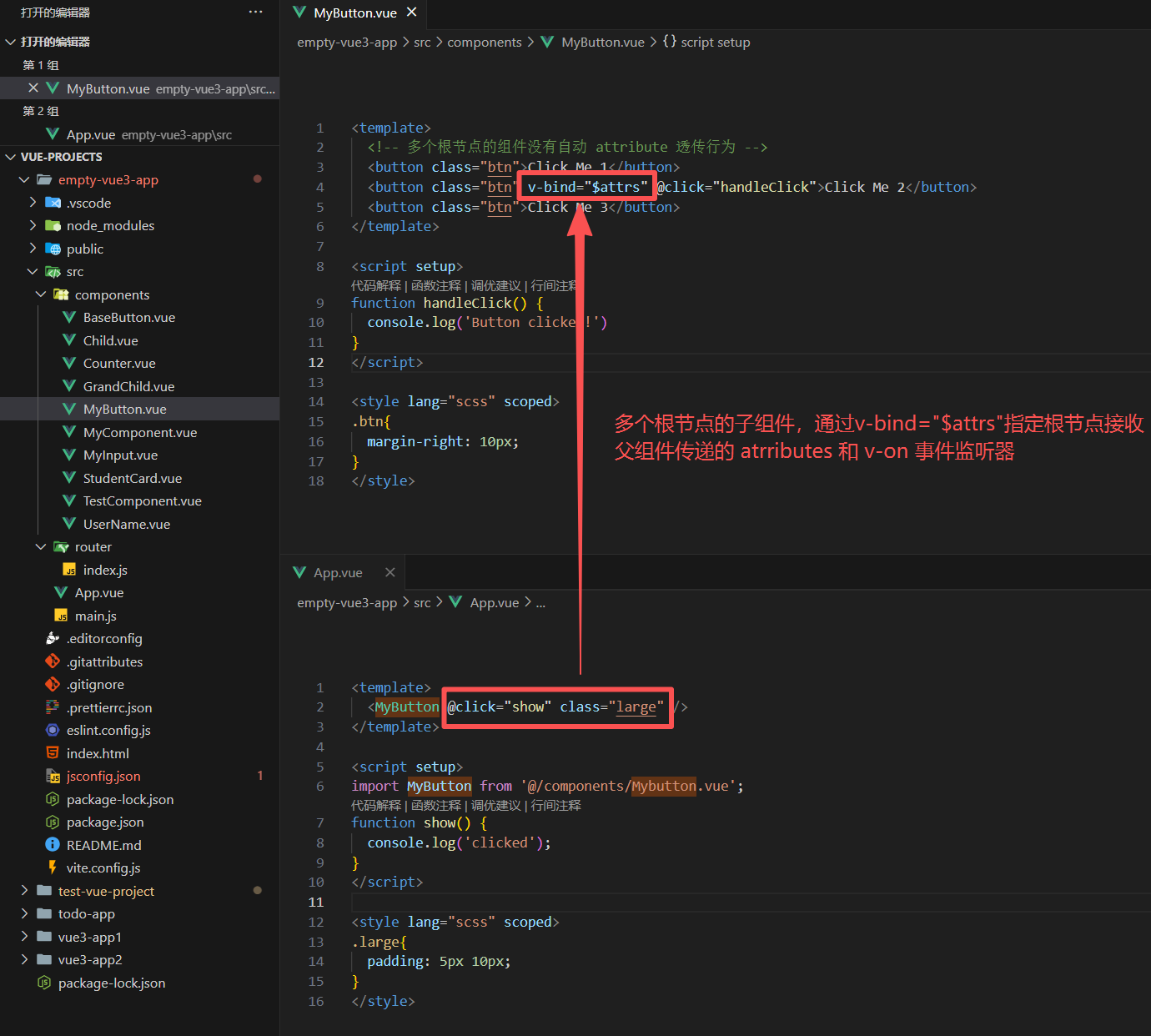 - [3. 多根节点的 Attribute 继承(使用 v-bind="attrs" 指定一个继承)](#3. 多根节点的 Attribute 继承(使用 v-bind="attrs" 指定一个继承))
