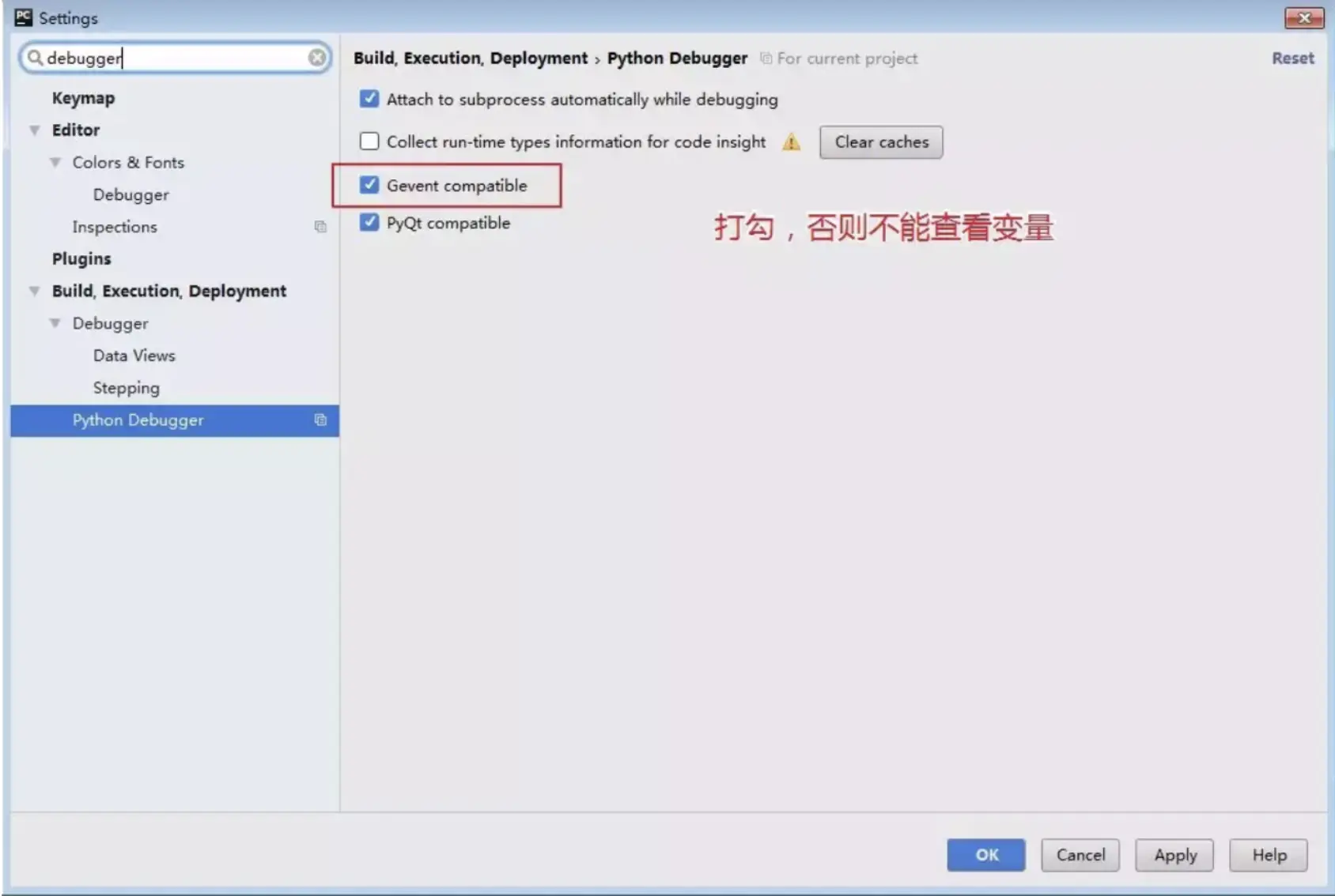 开启 Gevent compatible,如果不开启,在调试过程中,很可能出现无法调试,或者无法追踪/查看变量等问题。
