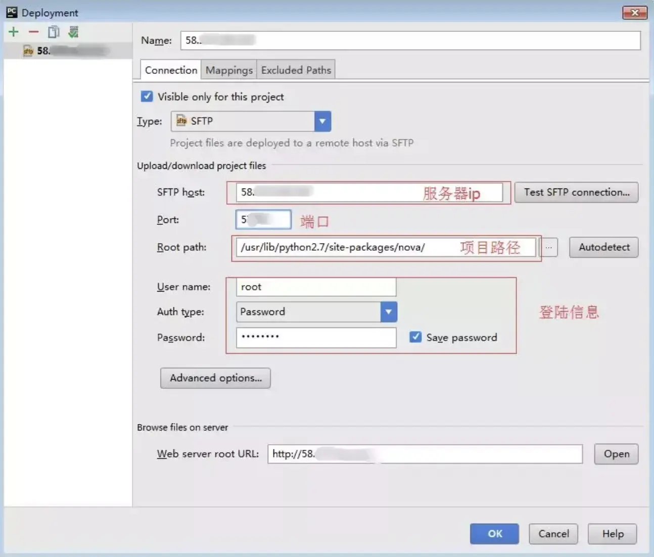 填写远程服务器信息,跟之前的一样,不再赘述。