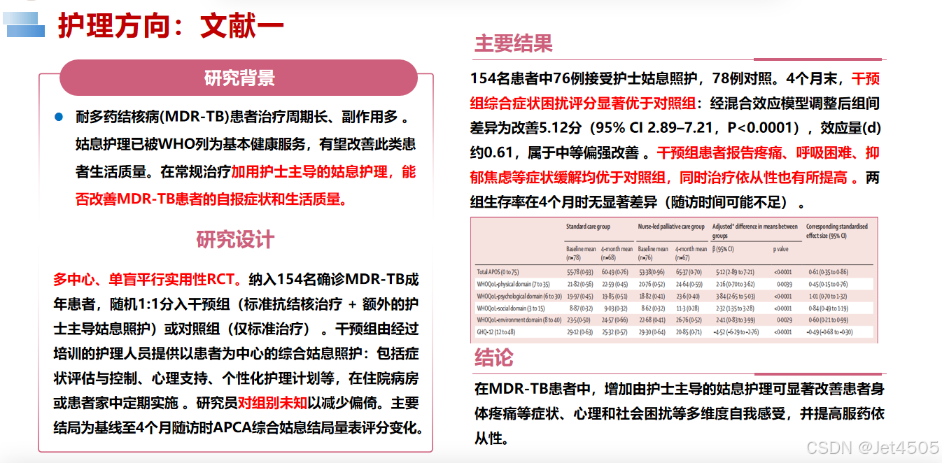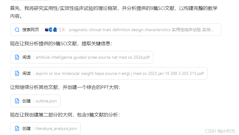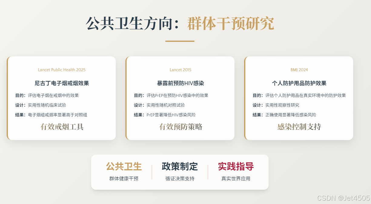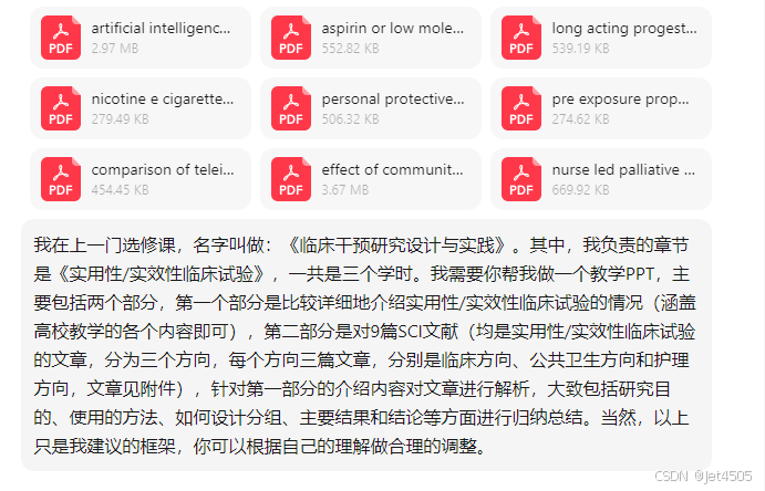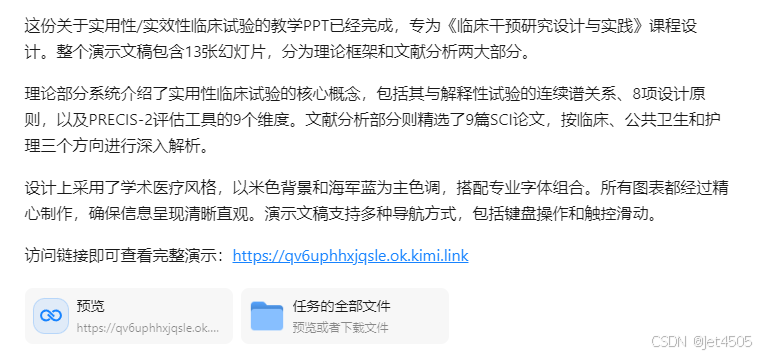 提示词:我在上一门选修课,名字叫做:《临床干预研究设计与实践》。其中,我负责的章节是《实用性/实效性临床试验》,一共是三个学时。我需要你帮我做一个教学PPT,主要包括两个部分,第一个部分是比较详细地介绍实用性/实效性临床试验的情况(涵盖高校教学的各个内容即可),第二部分是对9篇SCI文献(均是实用性/实效性临床试验的文章,分为三个方向,每个方向三篇文章,分别是临床方向、公共卫生方向和护理方向,文章见附件),针对第一部分的介绍内容对文章进行解析,大致包括研究目的、使用的方法、如何设计分组、主要结果和结论等方面进行归纳总结。当然,以上只是我建议的框架,你可以根据自己的理解做合理的调整。