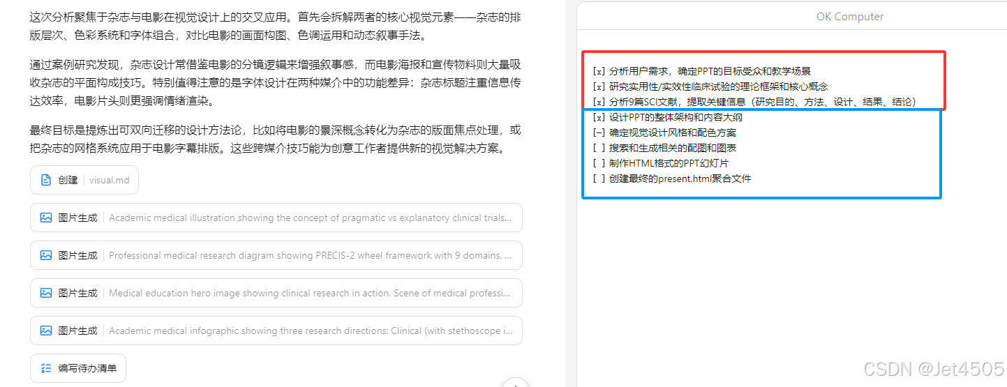 (2)生成的版面更像是产品发布会或项目展示汇报,视觉效果简洁,但学术感不足,这与提示词设置及账户额度限制有关。