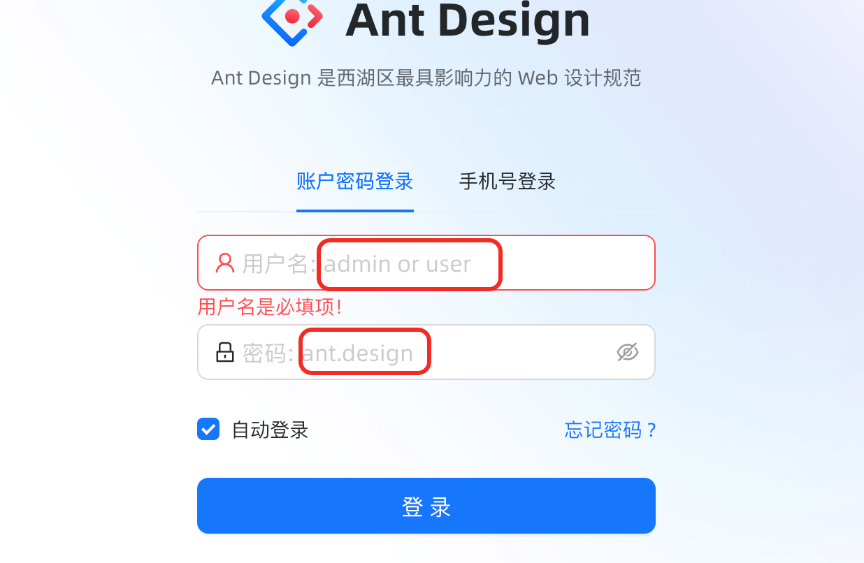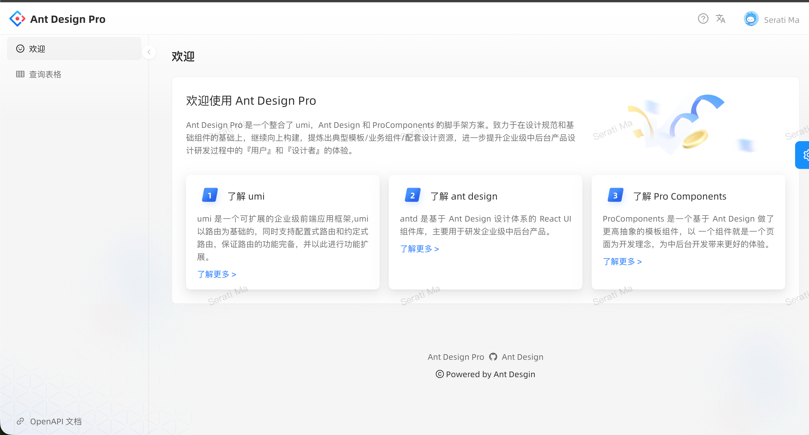 首次运行会要求登录 Ant Design Pro 账户,用于模板下载。