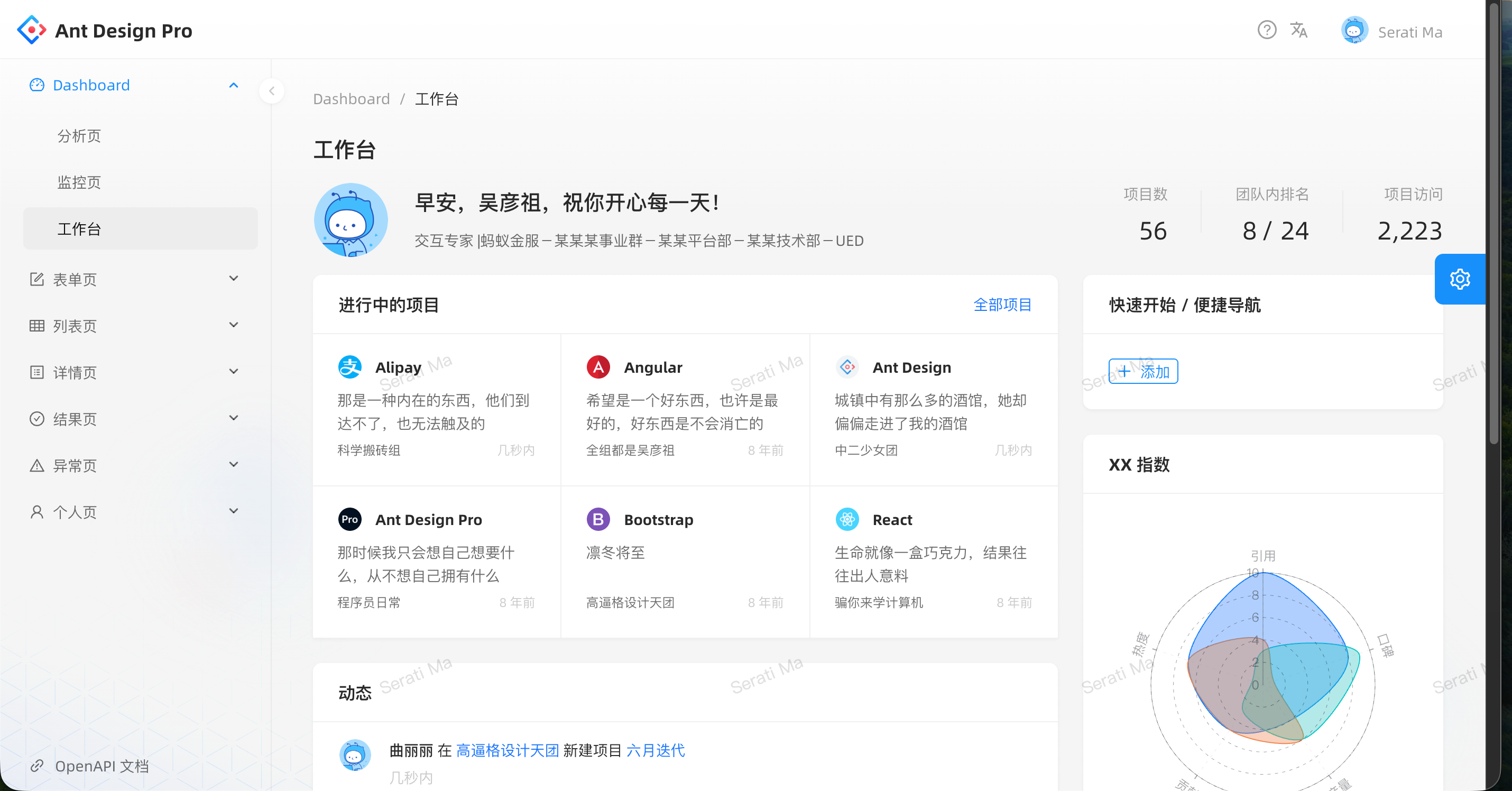 和 Umi的企业级中后台前端框架,提供了完善的布局、权限、菜单、国际化、Mock 数据等能力,让开发者能够快速搭建管理系统或中台项目。