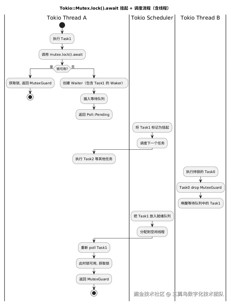 可以看出,tokio的异步锁内部维护任务队列,以及任务挂起和唤醒机制,保证了即使暂时拿不到锁,也不会阻塞当前线程,只是暂时挂起任务,执行其他可执行的任务。