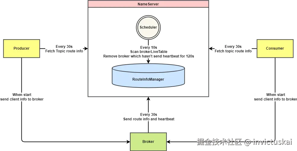 - 网络交互Netty层面的,NameServer和Broker会建立长连接Channel,在此期间,如果Channel中120s没有进行 读 | 写 操作的时候,同样会进行关闭socket,触发destory操作 (具体细节我们讲通信层的时候在讲)