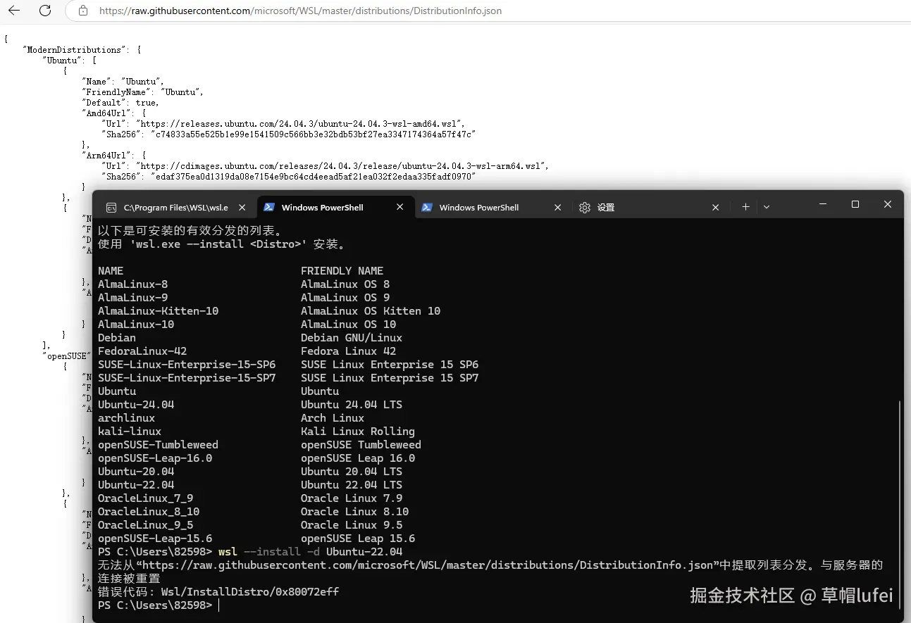无法从"https://raw.githubusercontent.com/microsoft/WSL/master/distributions/DistributionInfo.json"中提取列表分发。操作超时