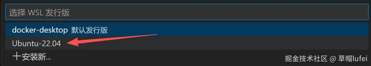 安装好以后,在编辑器中点左下角的图标,选择 使用发行版连接到WSL,选择自己安装的对应的 Linux 发行版,这里选择之前安装的 Ubuntu-22.04 版本