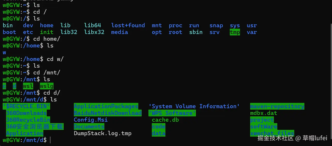 进入 Ubuntu 系统后,默认家目录是没有任何东西的,原来系统中对应的文件在 /mnt 下面,里面有 C D 两个盘,例如进入 D 盘后的内容和在 Win11 系统中打开的 文件资源管理器 下面的内容一样