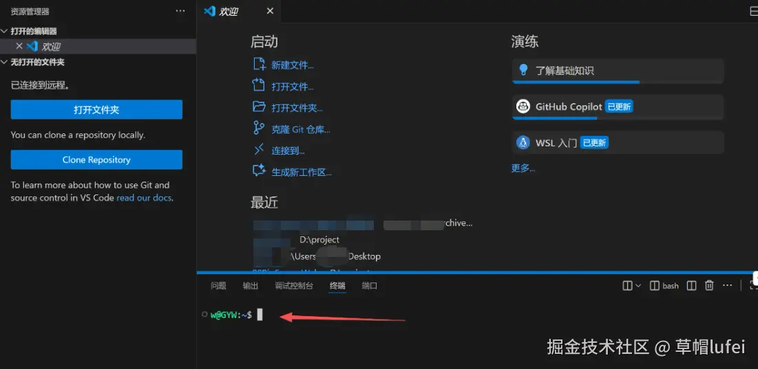 选择后,会重新打开 VSCode 新页面,这时候的终端就是 Ubuntu 环境了