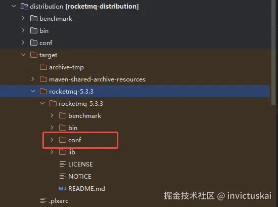 编译完成之后会在distribution中创建一个target目录,如图所示有一个conf文件夹