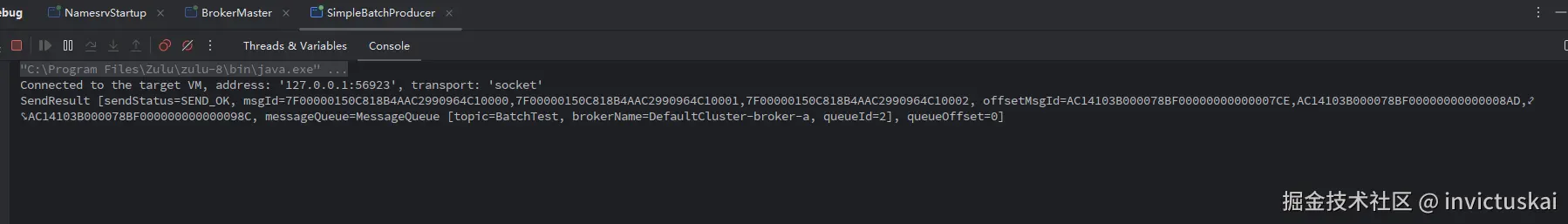 运行当前SimpleBatchProducer 控制台出现如下内容即为当前消息发送成功