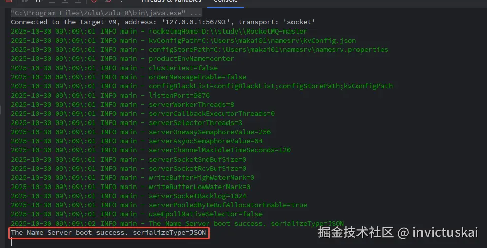 控制出现如下内容表示Namesrv启动成功