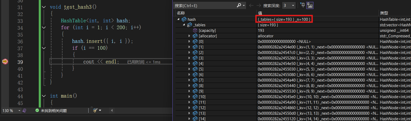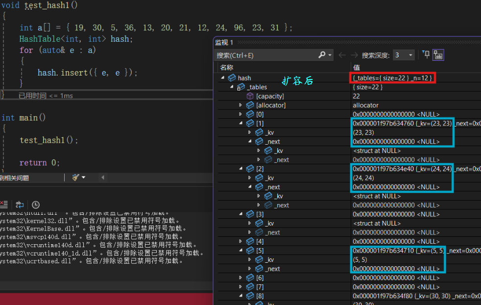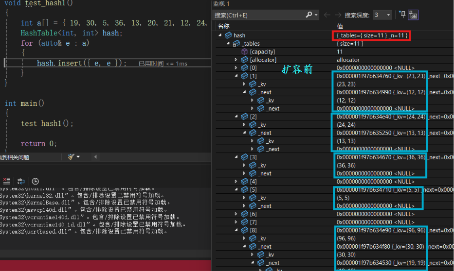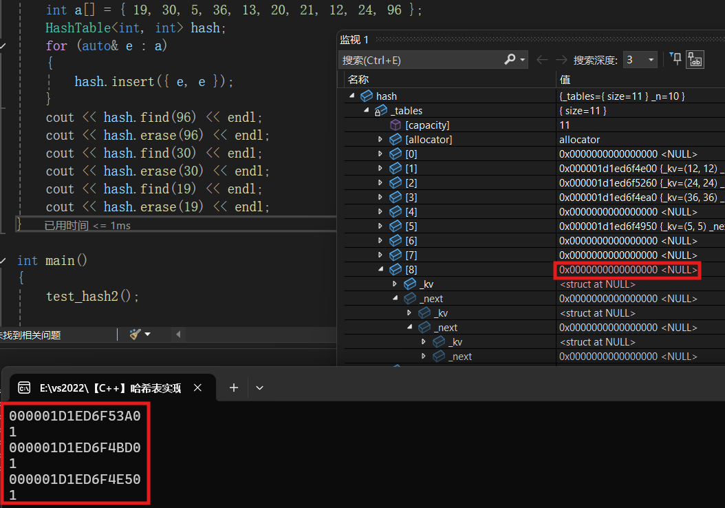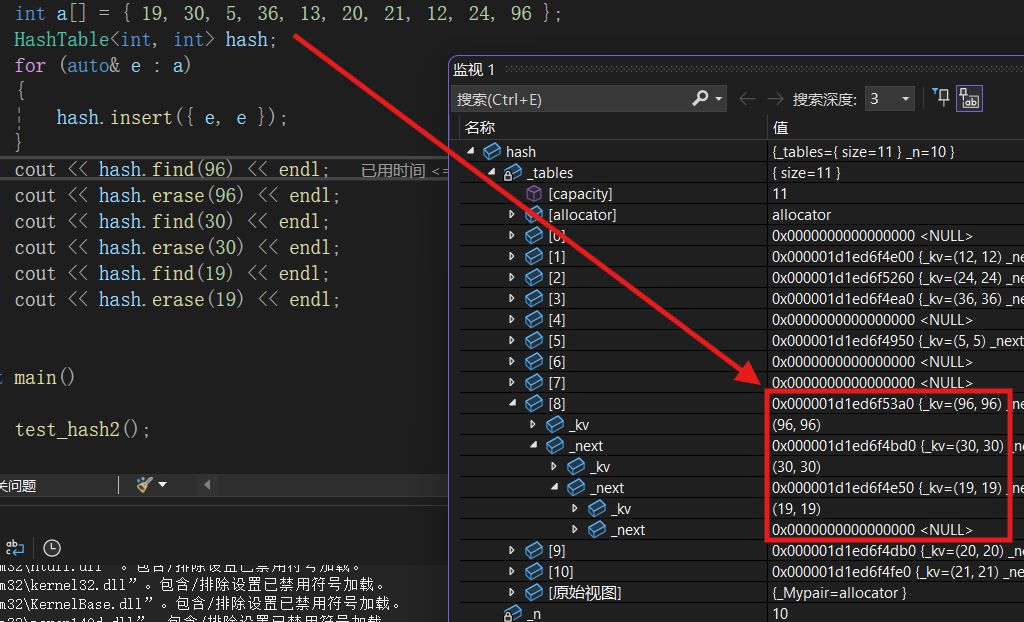 我们依旧按照之前的代码进行测试,我们发现96, 30, 19在一个桶中,我们把这三个全部删掉。