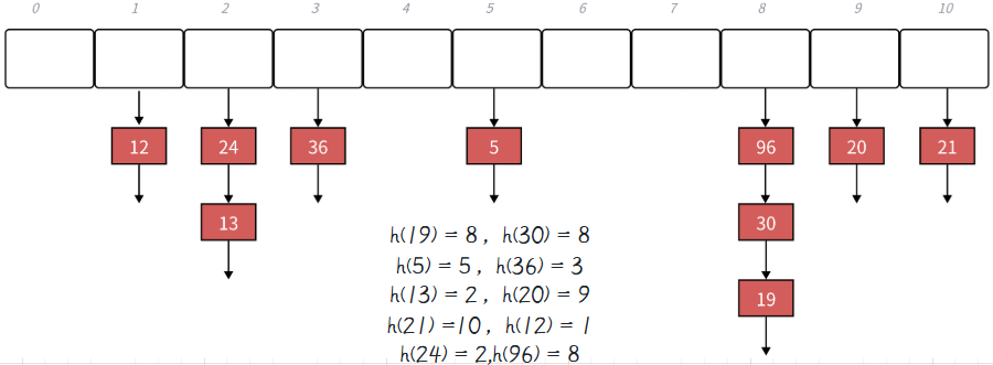 下面演示 {19,30,5,36,13,20,21,12,24,96} 等这一组值映射到M=11的表中。