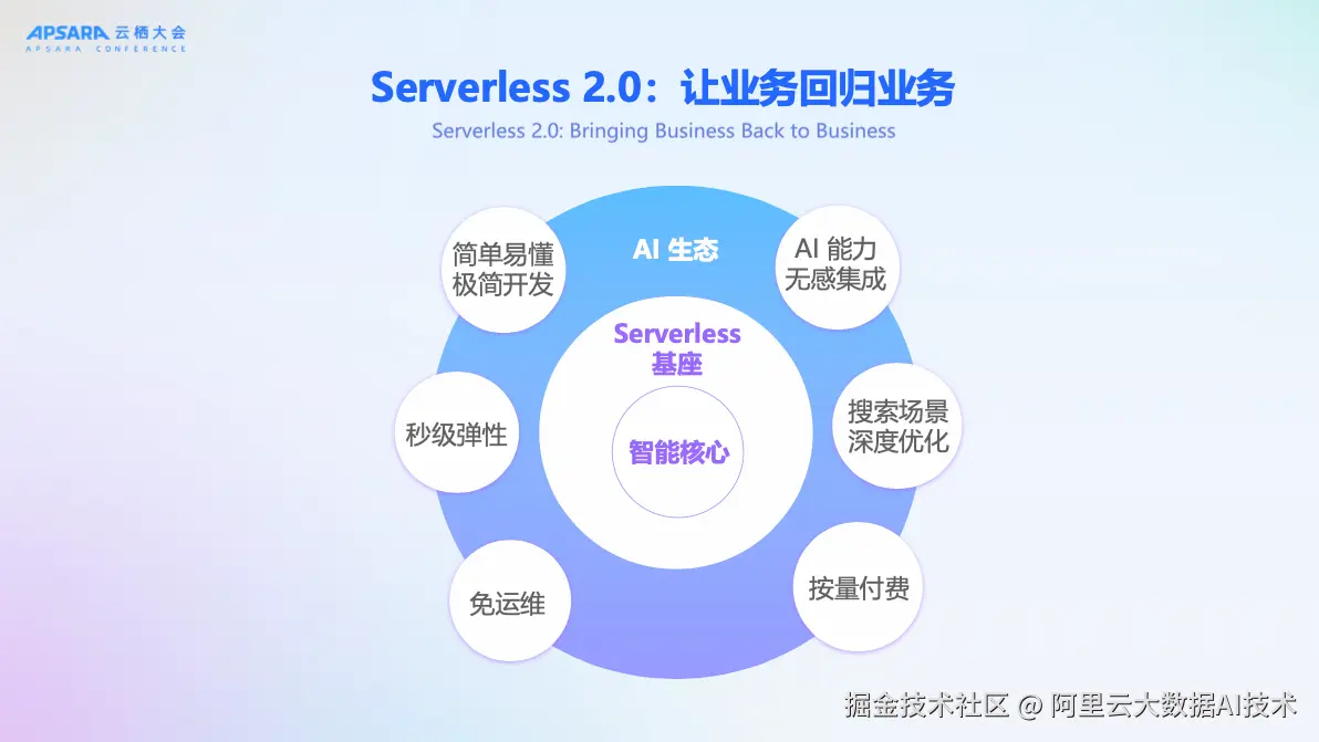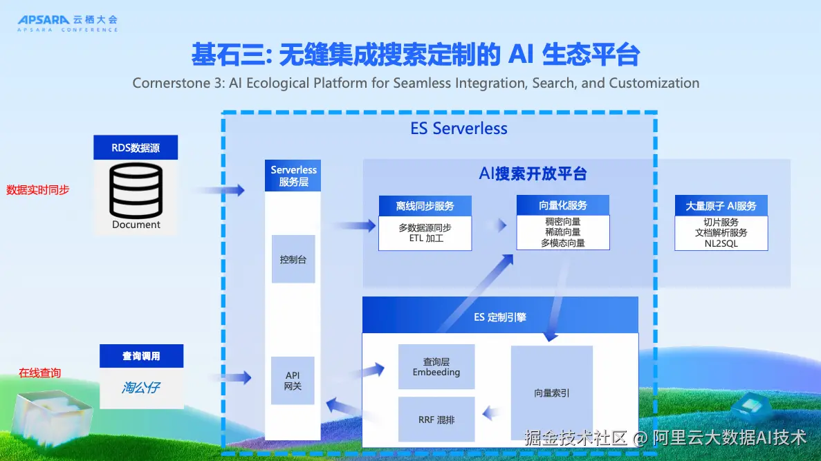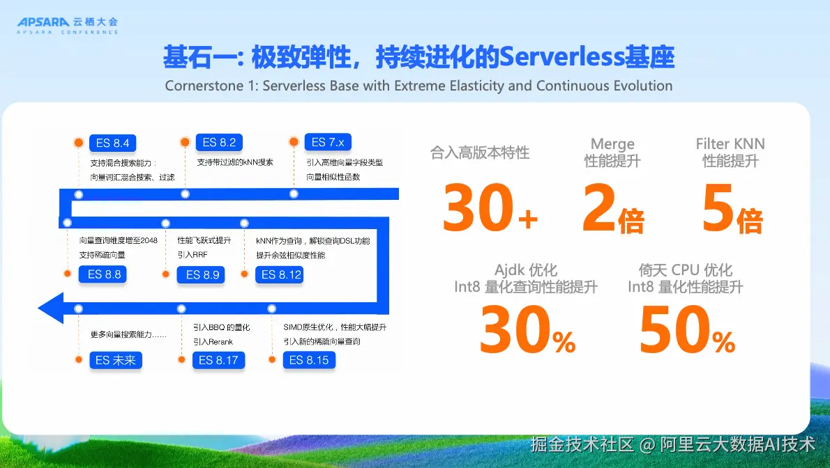 2025年9月26日,在杭州云栖大会"AI搜索与向量引擎"分论坛上,阿里云智能集团高级技术专家------贾新禹 正式发布 Elasticsearch Serverless 2.0 ,并首次系统性阐述其技术架构与产品价值。这一全新升级的Serverless解决方案,以"极致弹性、智能核心、AI生态融合 "三大技术基石,直面AI搜索时代的工程化挑战,为企业提供一站式构建AI搜索能力的基础设施。