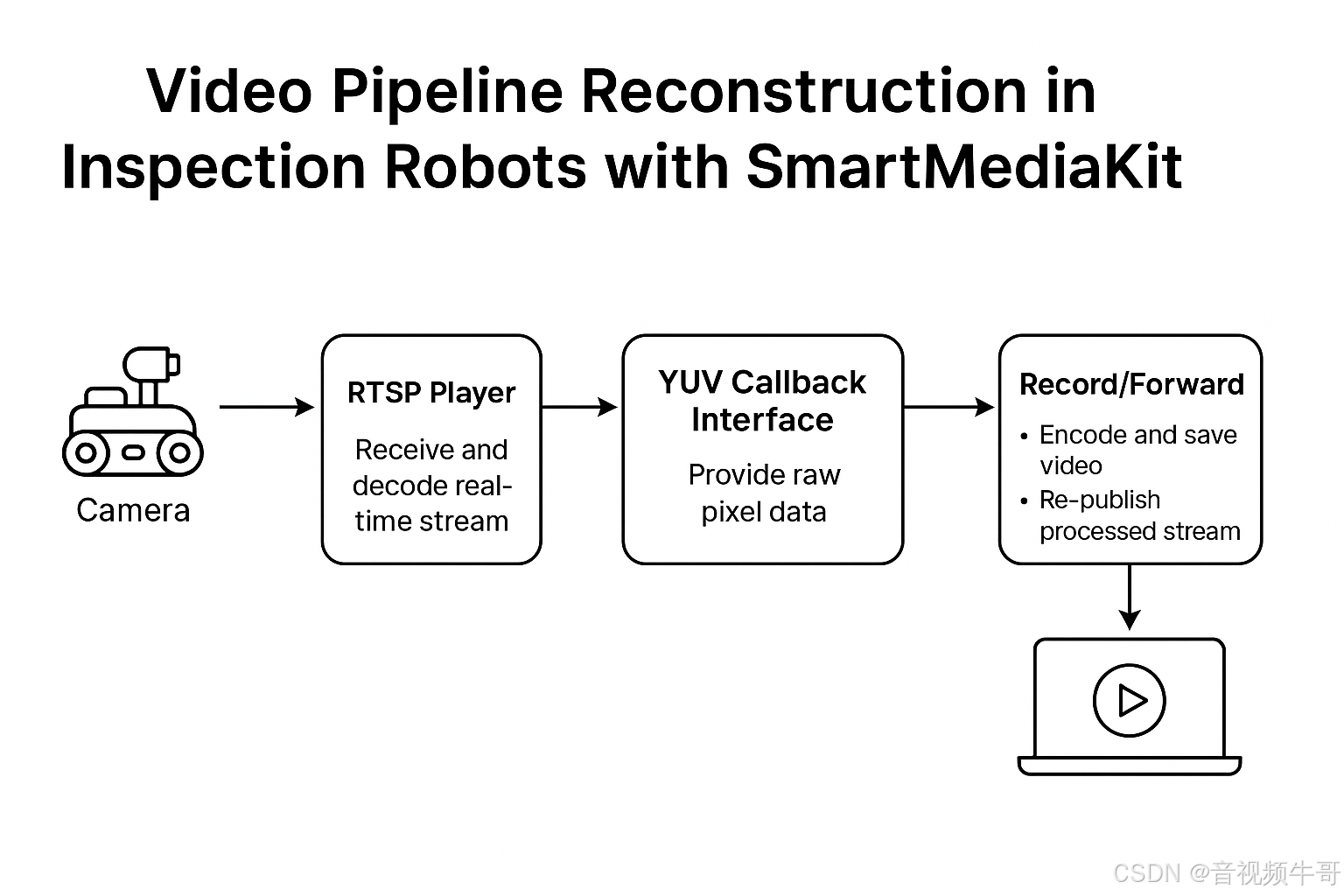 大牛直播SDK(SmartMediaKit)以其全自研的跨平台音视频内核,为检测机器人提供了一条从"感知端"到"协同端"的完整链路。通过 Android 端 RTSP 播放器模块及 YUV 数据回调机制,系统可在实时播放的同时进行 动态水印叠加、录像存档、二次编码以及轻量级 RTSP 服务再发布 。