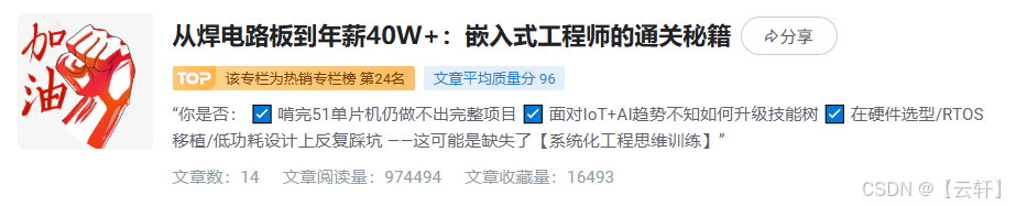 | 点击下面图片带您领略全新的嵌入式学习路线 🔥爆款热榜 90万+阅读 1.6万+收藏