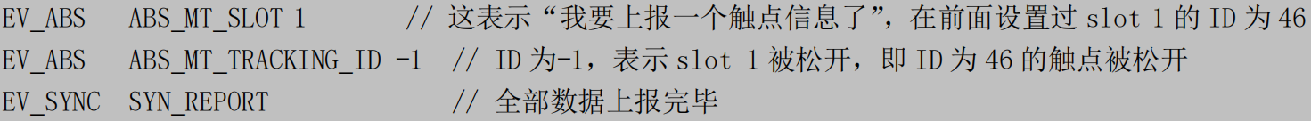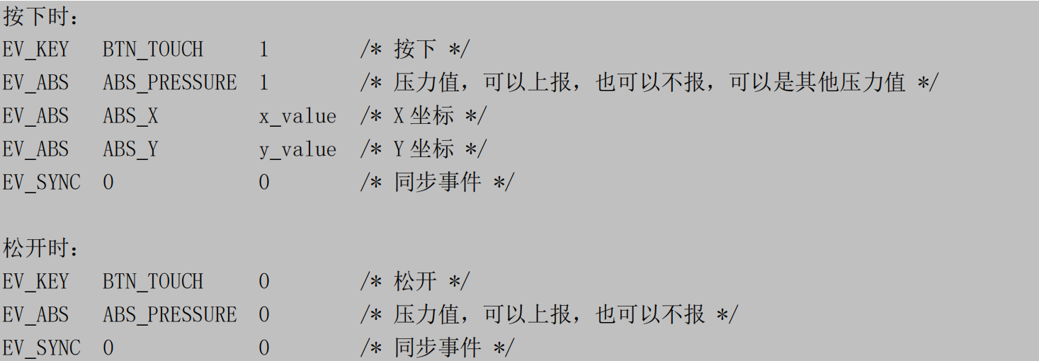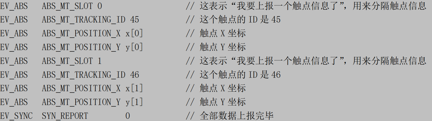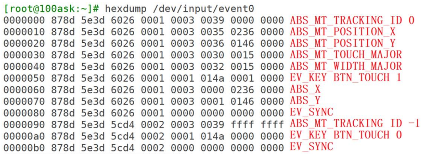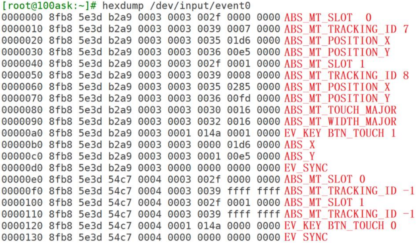 在上面的数据中,为了兼容老程序,它也上报了 ABS_X、ABS_Y 数据,电阻触摸屏就是使用这类型的数据。所以基于电阻屏的程序,也可以用在电容屏上。而两个MAJOR数据则是表示TOUCH面积的一个参数,暂时不需要了解。其他的基本和上面描述的一致。