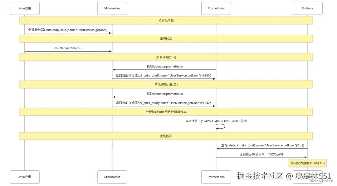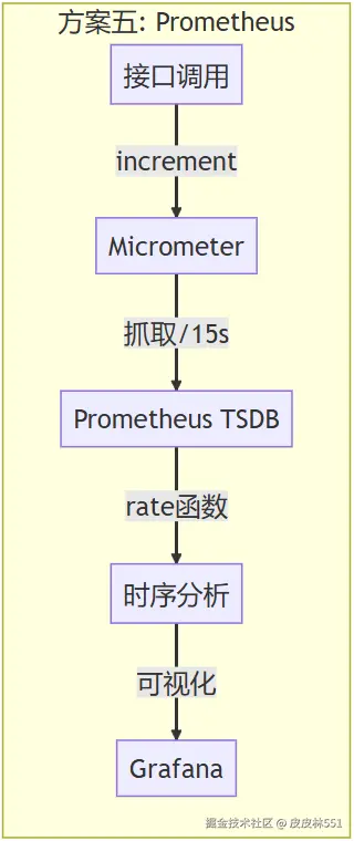 | Micrometer+Prometheus | 高 | 完整监控生态,支持多维标签、告警、可视化仪表盘,可自定义各种聚合分析 | 配置复杂,资源消耗较大,需要部署监控系统,学习成本高 | 企业级生产环境、需完整监控链路场景 |