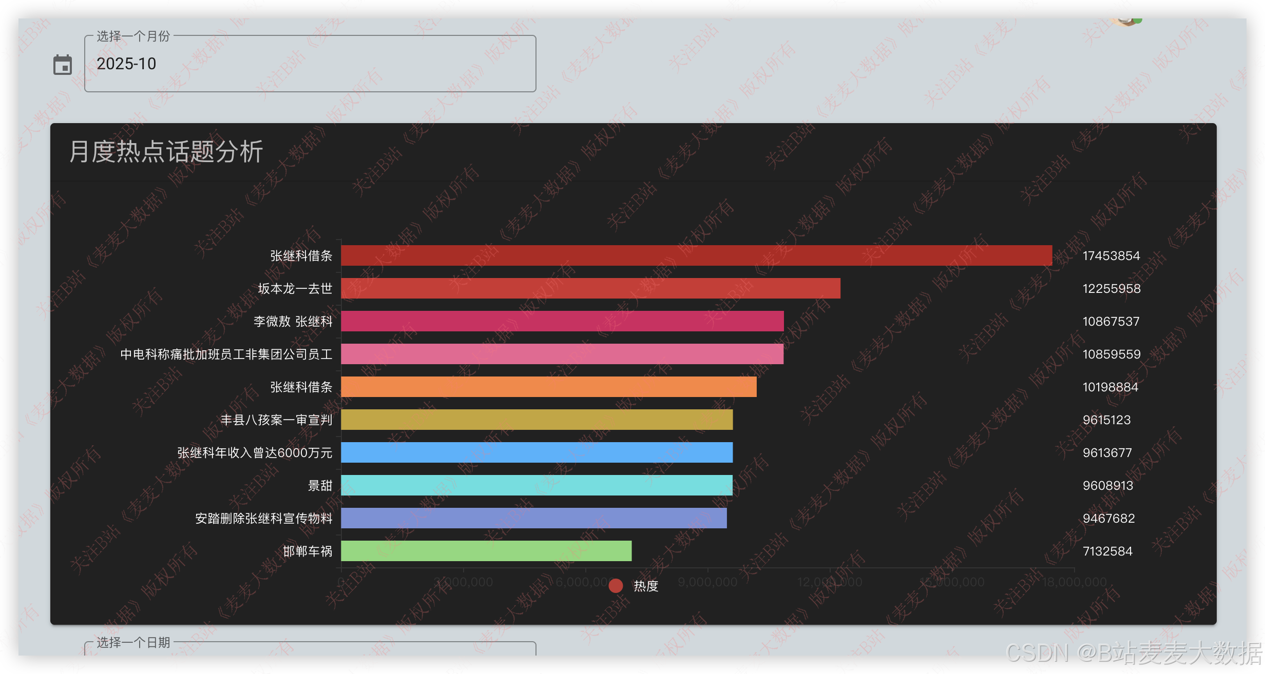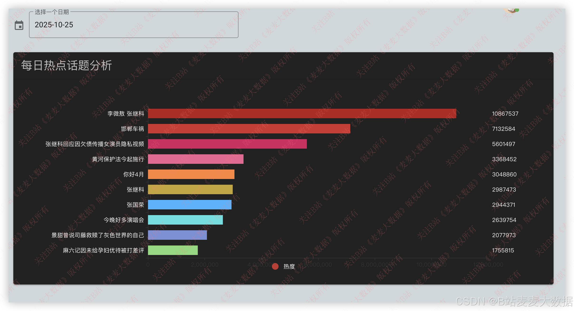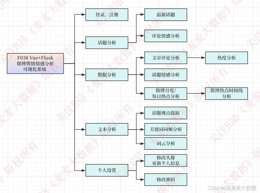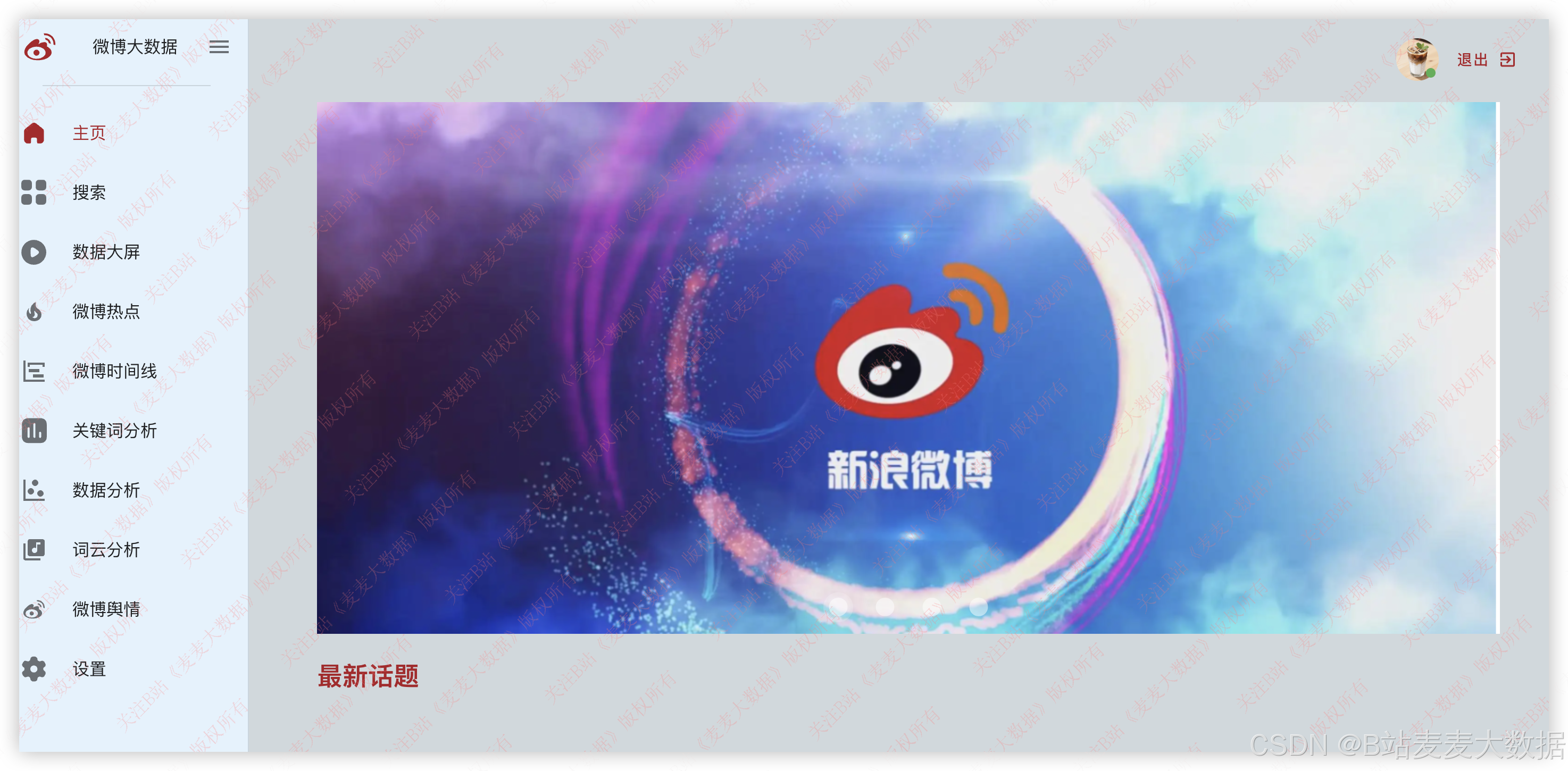 系统简介:本系统是一个基于Vue+Flask+MySQL的微博数据分析可视化平台,构建于典型的B/S架构之上。系统通过实时爬虫技术获取微博最新动态数据,实现对热门话题、评论信息的深度挖掘与多维分析。主要功能模块包括:首页动态展示实时热点话题与情感热度指数;数据看板呈现微博话题的词云图谱、情感分布雷达图及评论热力分析;可视化中心集成时间轴控件展示每日/每月热点演化过程,支持关键词抽取、TF-IDF词频统计、TextRank算法分析等文本处理功能;情感分析模块采用机器学习模型实现评论级情感倾向判定(正面/中性/负面),并生成情感趋势折线图;用户中心包含登录注册体系及个人信息管理功能,支持头像上传、密码修改等个性化设置,为用户提供安全的数据分析服务。