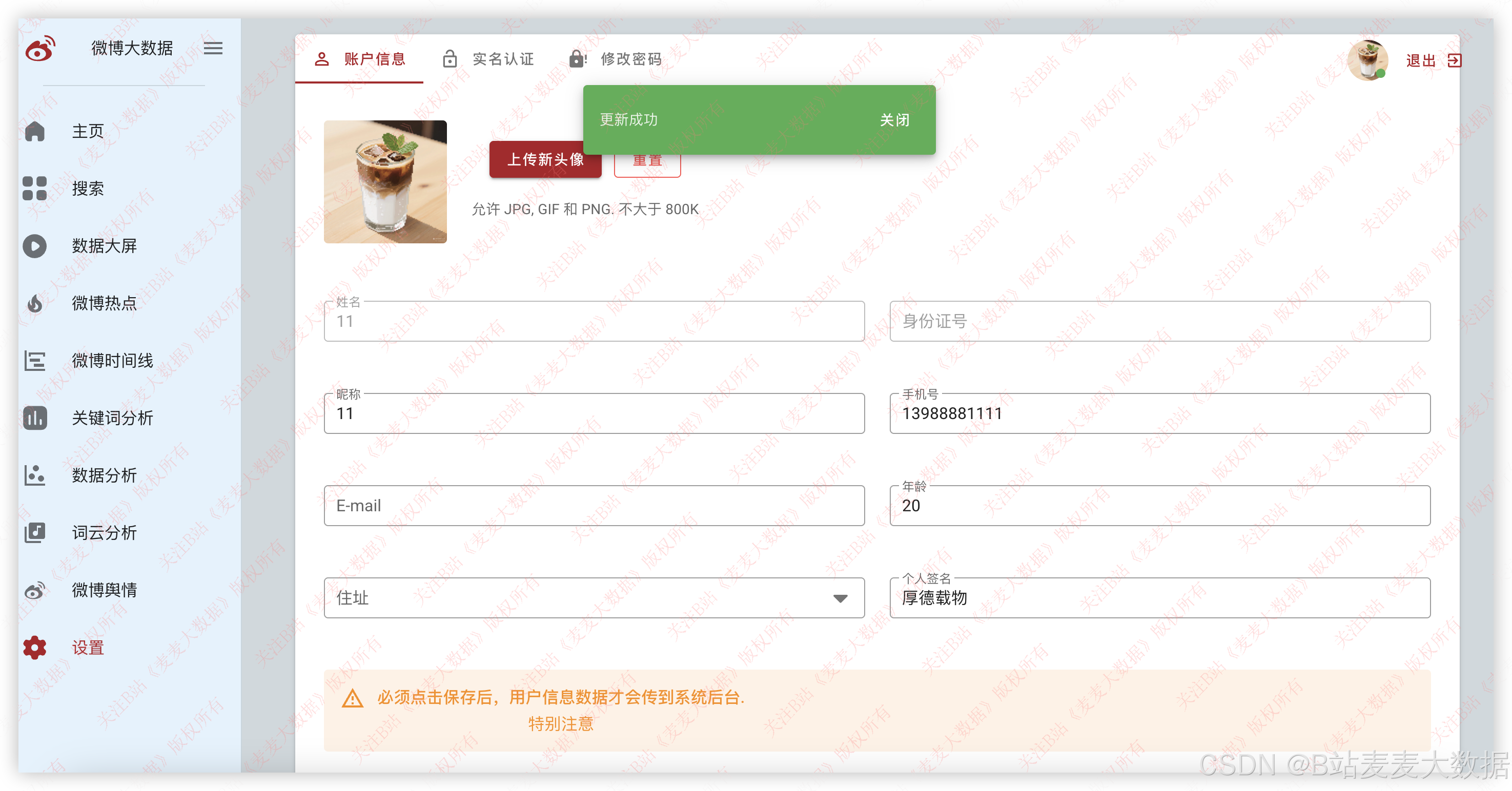 用户信息修改中可以上传头像,完成用户的头像个性化设置,也可以修改用户其他信息。