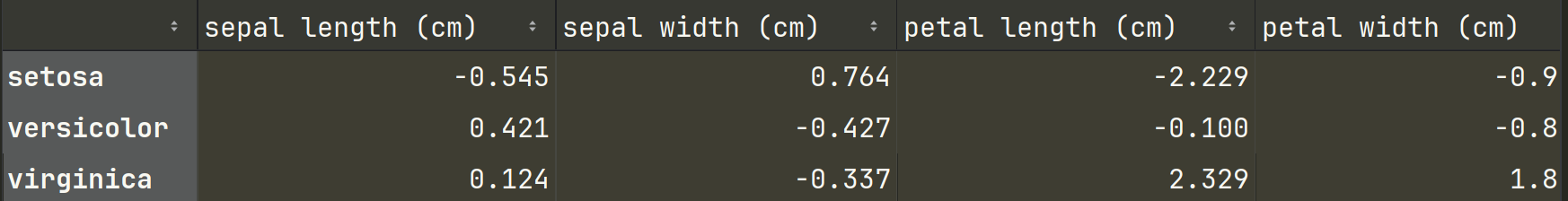 coef_df = pd.DataFrame(clf.coef_, columns=iris.feature_names, index=iris.target_names)