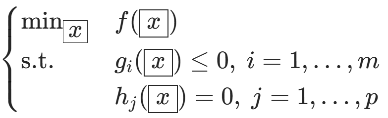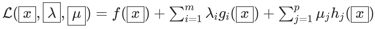 其中\(f, g_i\)是凸函数,\(h_j\)是仿射函数),其拉格朗日函数为: