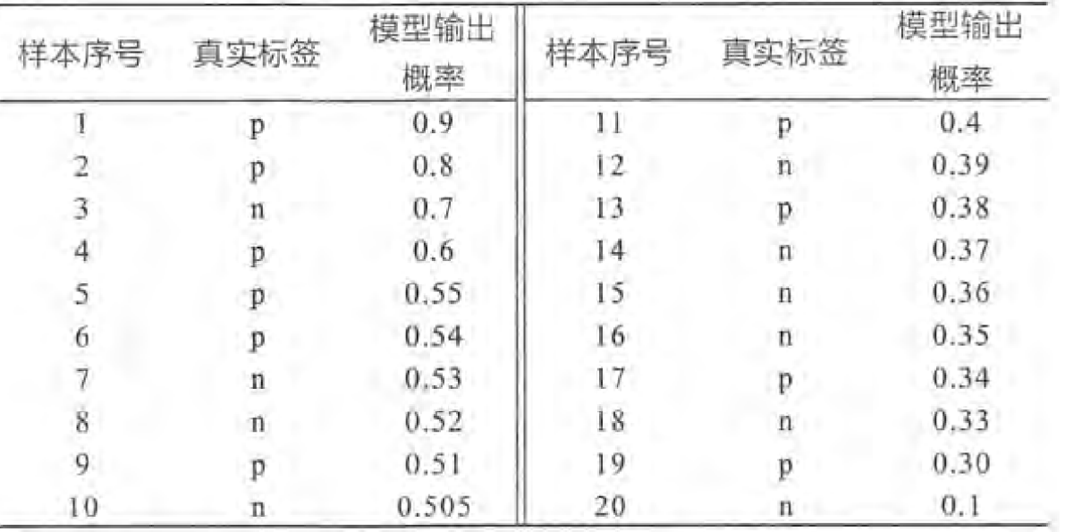 将 20 个样本按 "模型输出概率" 降序排列,得到如下顺序